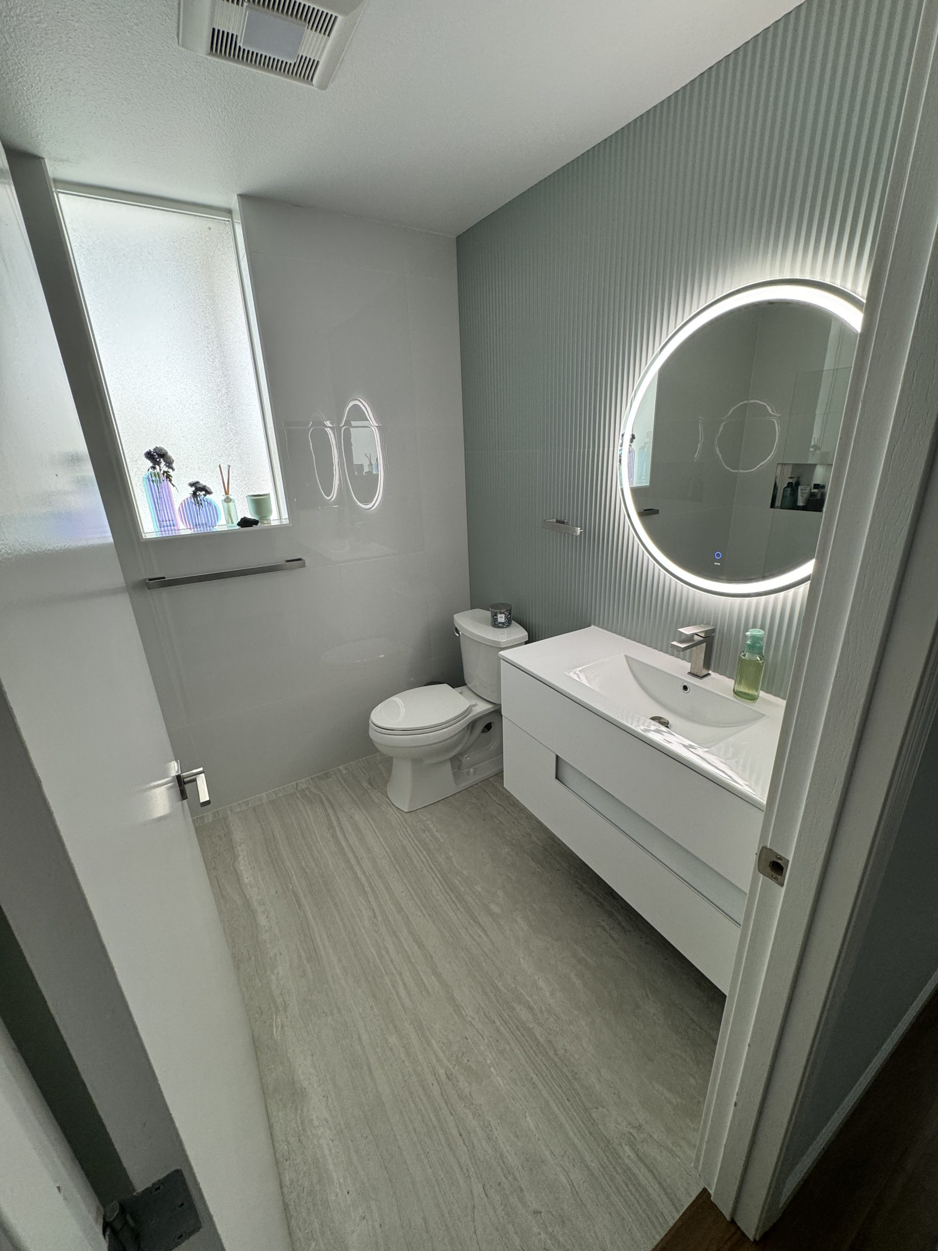A new vanity and mirror enhance storage, improve daily usability, and contribute to a clean, contemporary aesthetic.