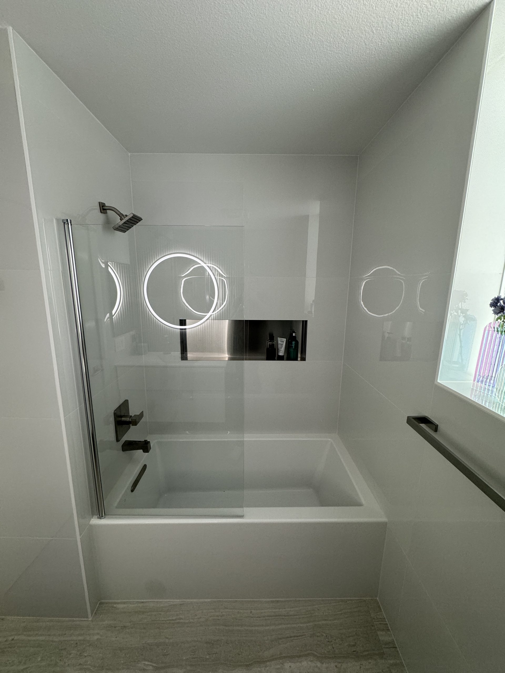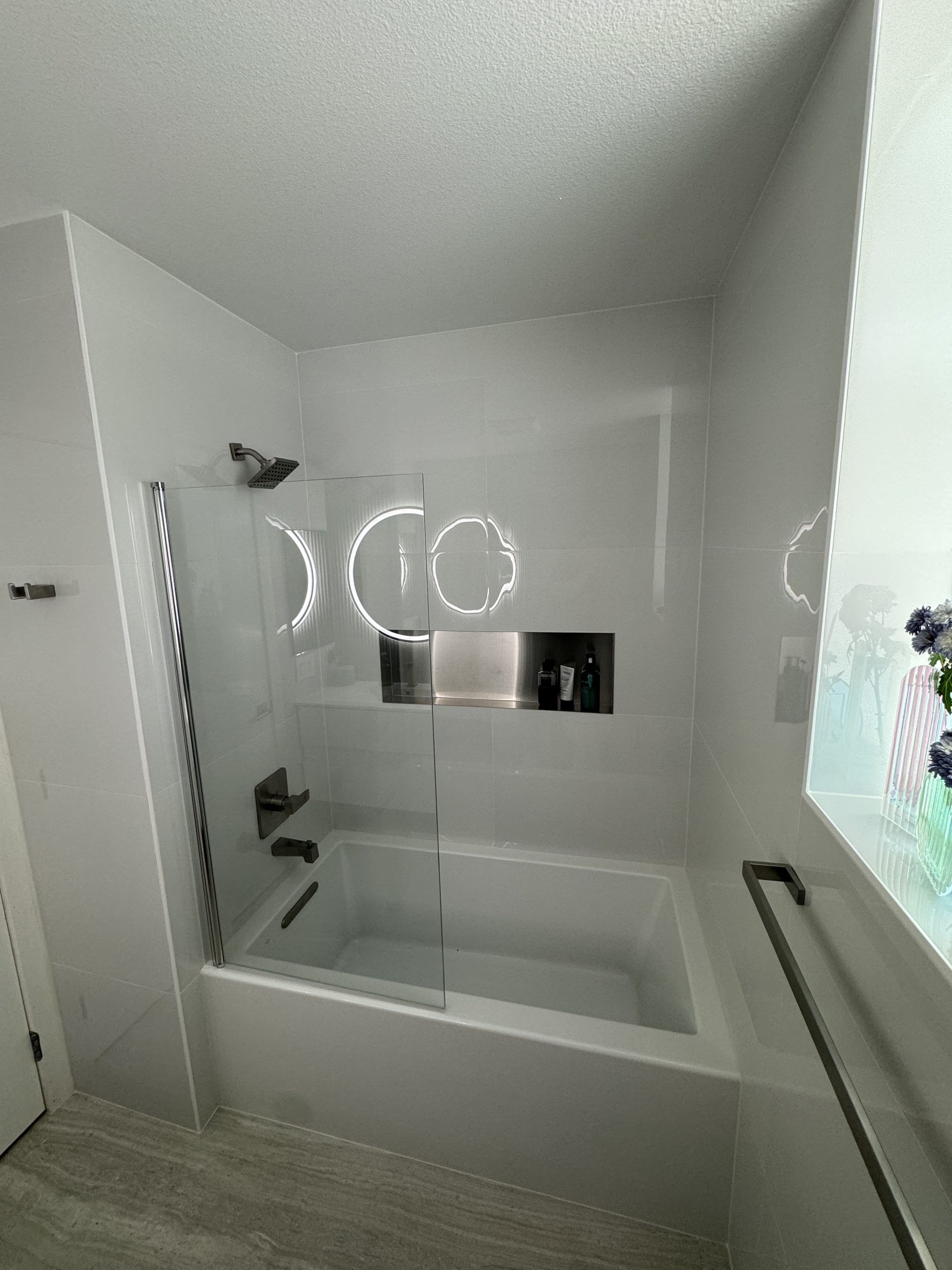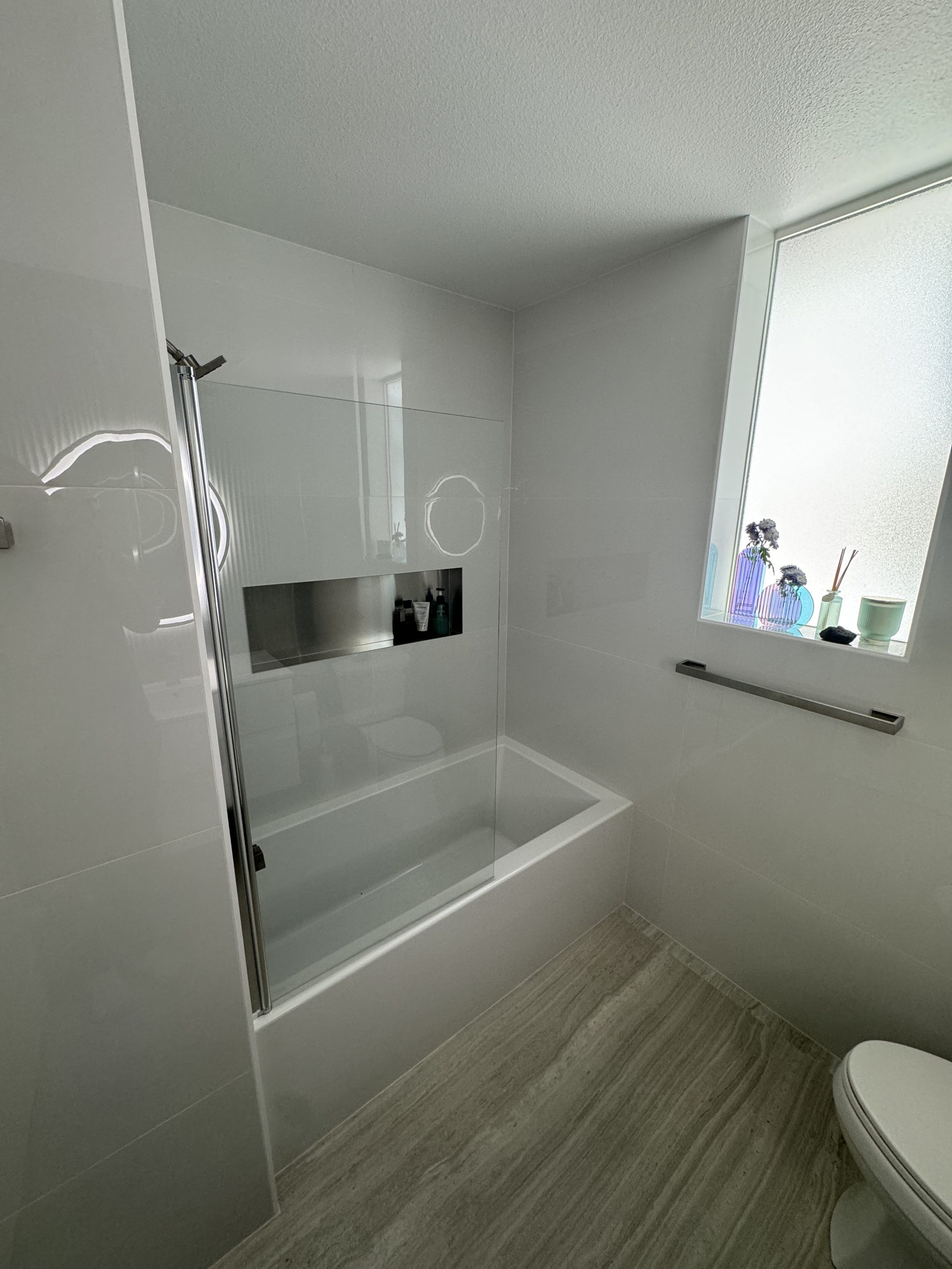 The installation of a new bathtub, paired with a built-in shampoo niche and a glass partition, creates a comfortable bathing area with a modern, open feel.
